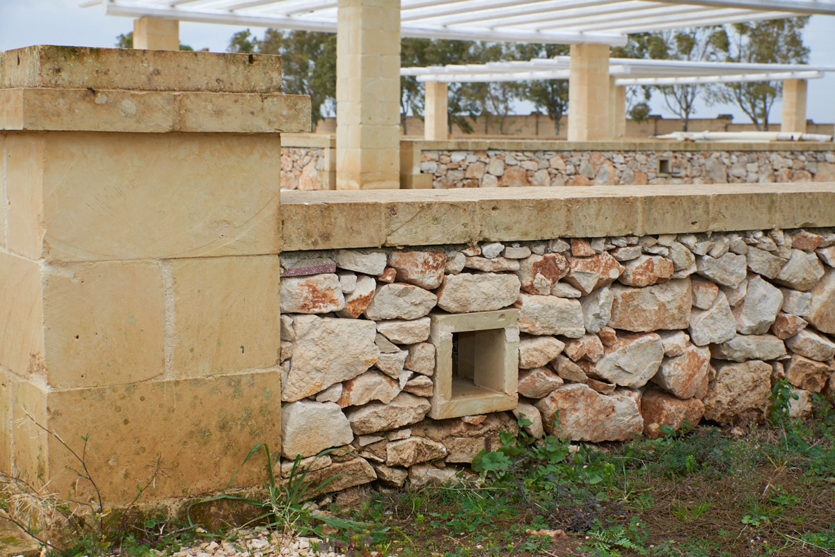Tutti i muretti interni e perimetrali sono realizzati seguendo rigorosamente le tecniche costruttive tradizionali, con un corpo in pietra leccese ed una rifinitura di superficie in carparo.
