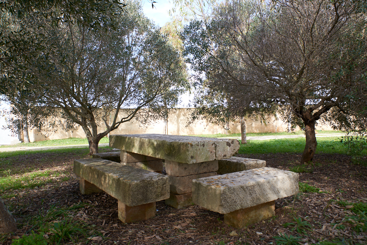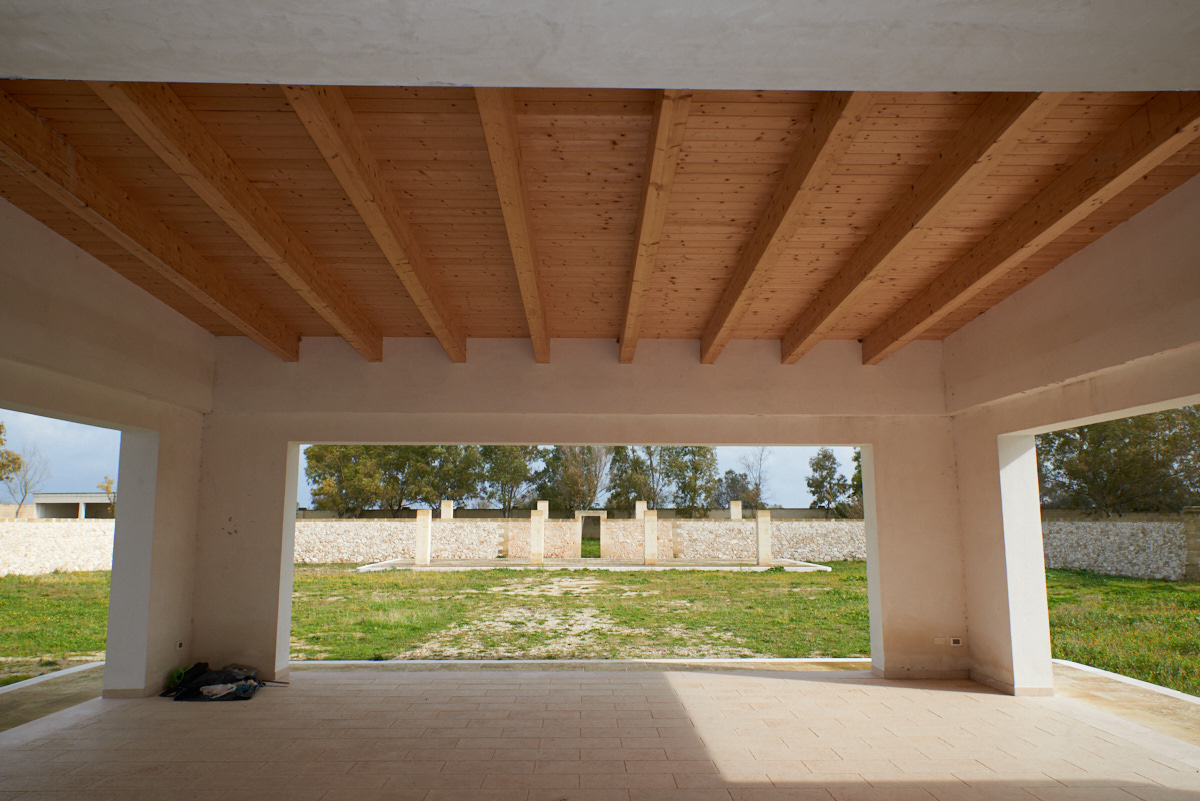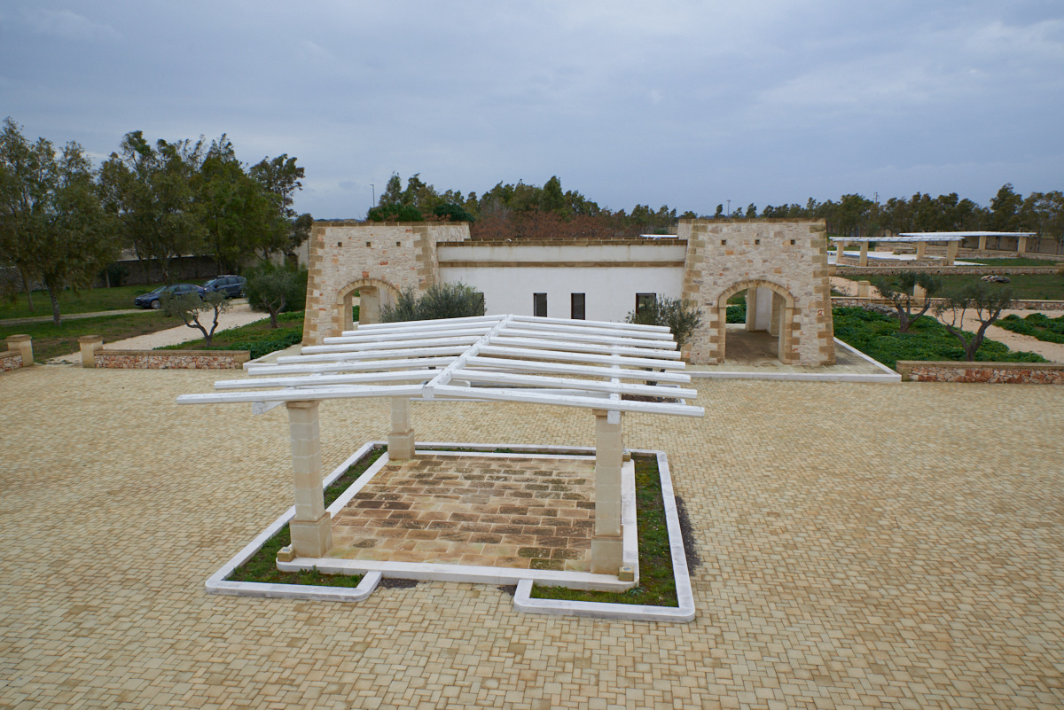 L’ampia corte interna è adornata da un pergolato realizzato in pietra e assi in legno che, nella forma, nella posizione e nella funzionalità, richiama le architetture dei chiostri interni barocchi e offre una zona d’ombra sotto la quale poter ammirare il panorama circostante.